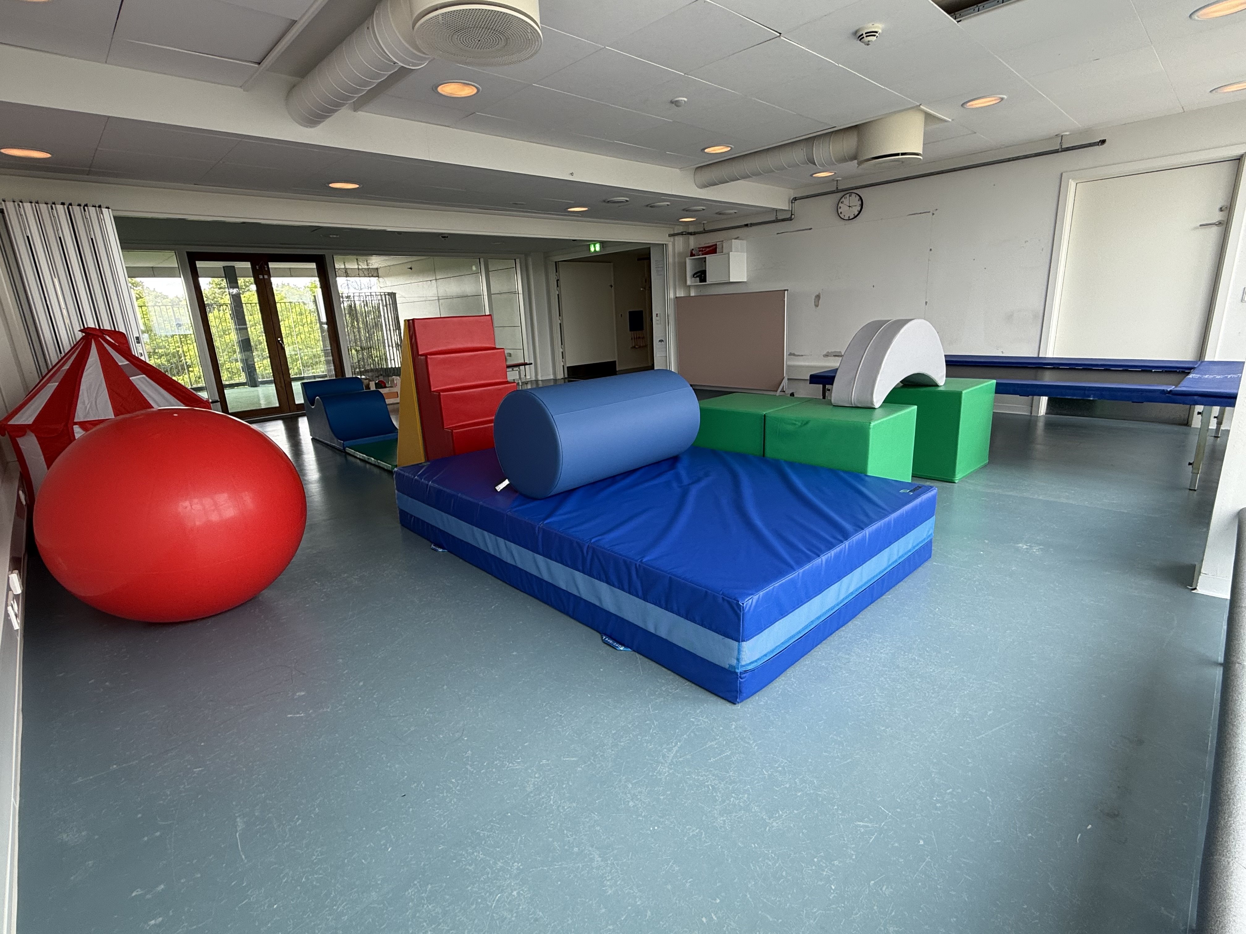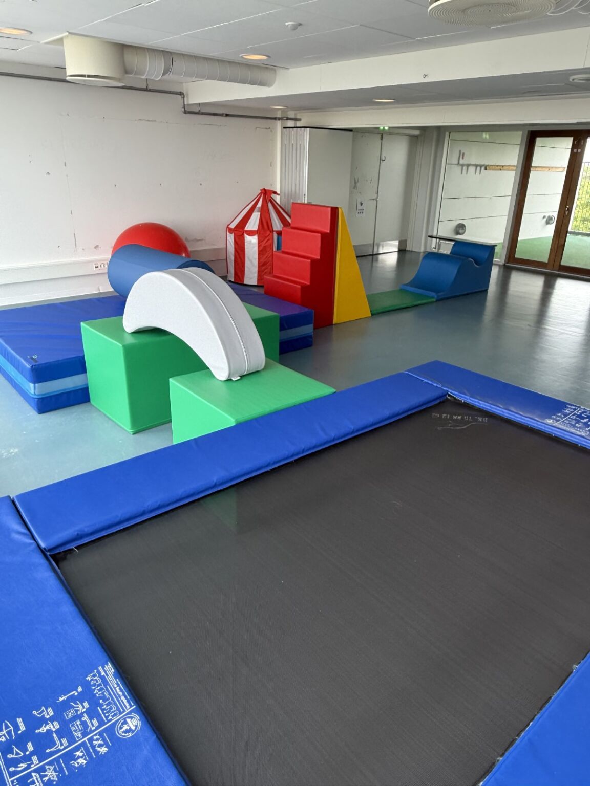 I Solsikken har vi et stort og lyst fællesrum blandt andet med trampolin og skumredskaber.